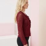 Cuenta con mangas largas y cuello con volado que se extiende hacia el escote, enmarcando la prenda con elegancia y suavidad. Su textura y caída la convierten en una opción ideal para elevar cualquier outfit, tanto de día como de noche.