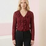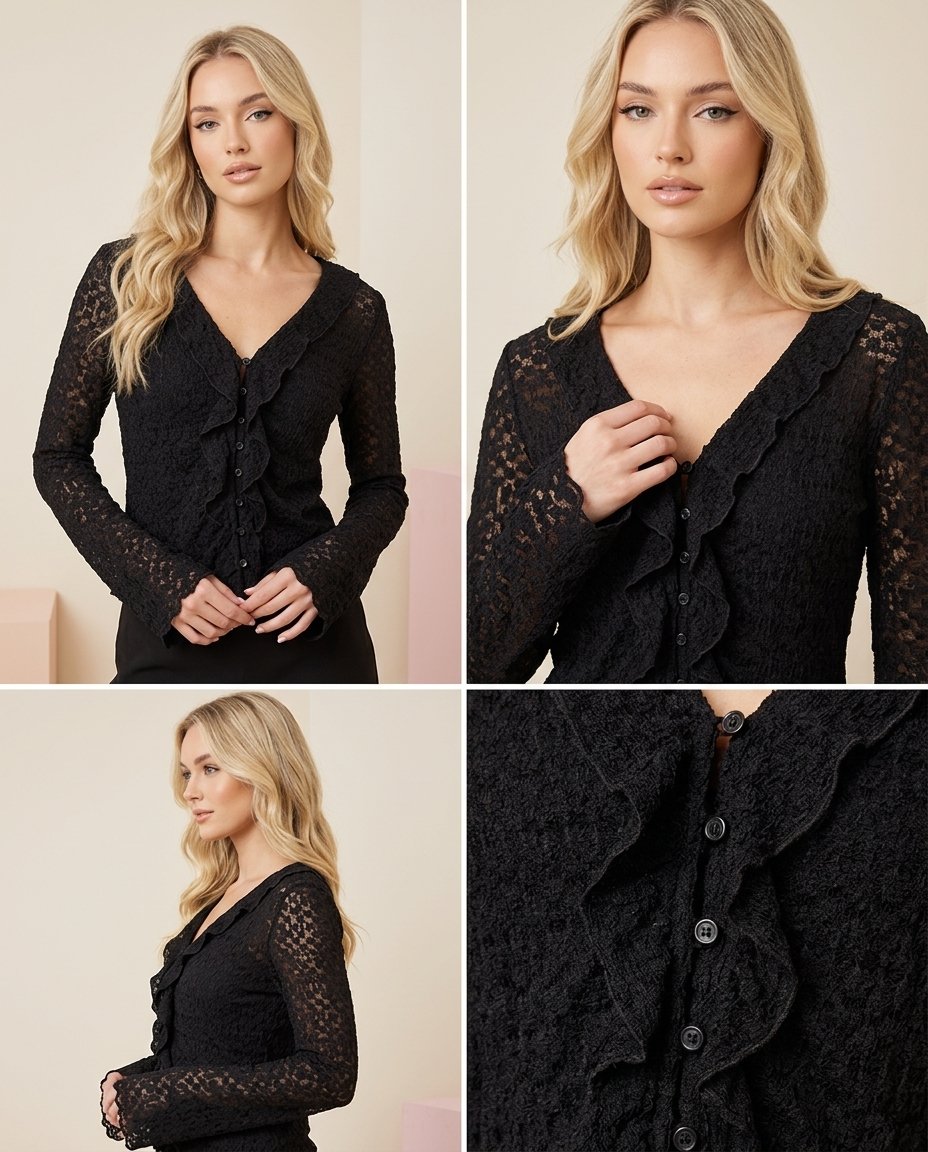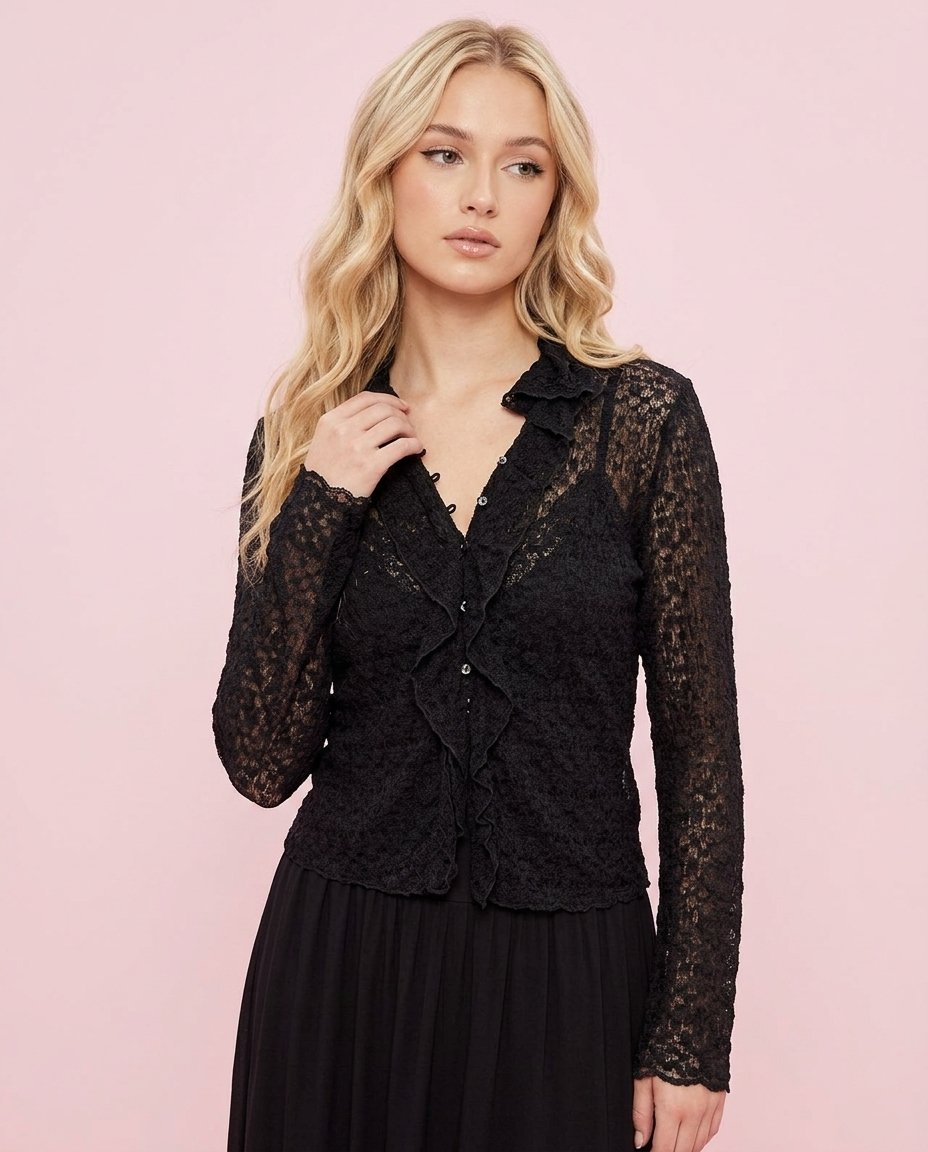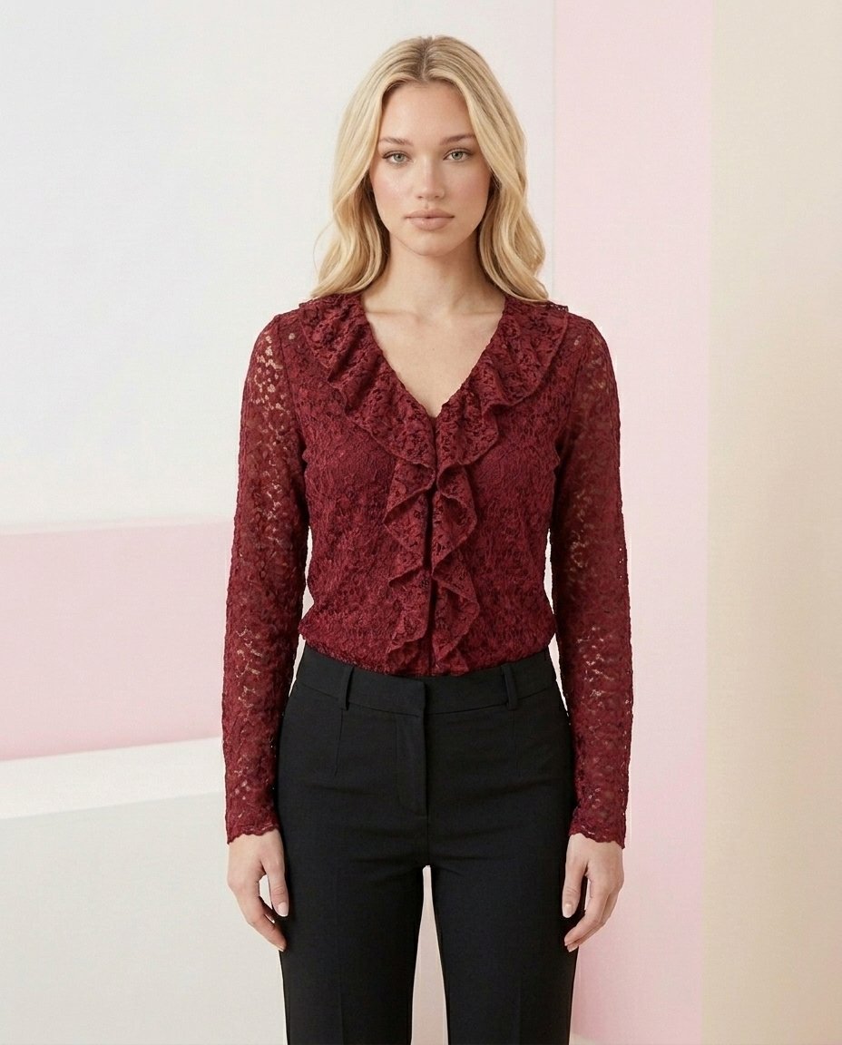 Blusa confeccionada en encaje delicado, pensada para aportar un aire romántico y sofisticado a tus looks. Su diseño con botonadura frontal se destaca por un volado que recorre todo el ribete, sumando movimiento y un detalle femenino único.