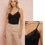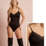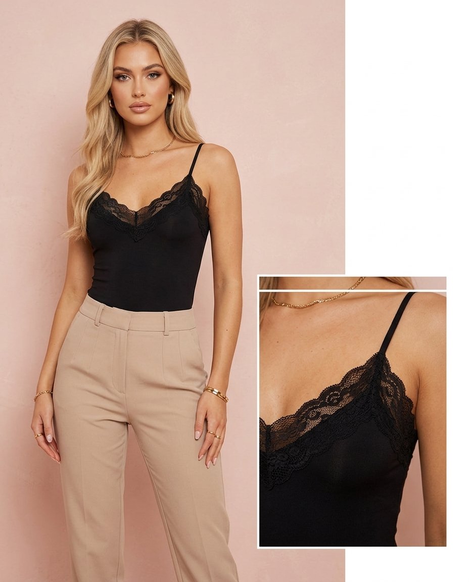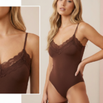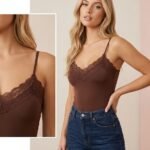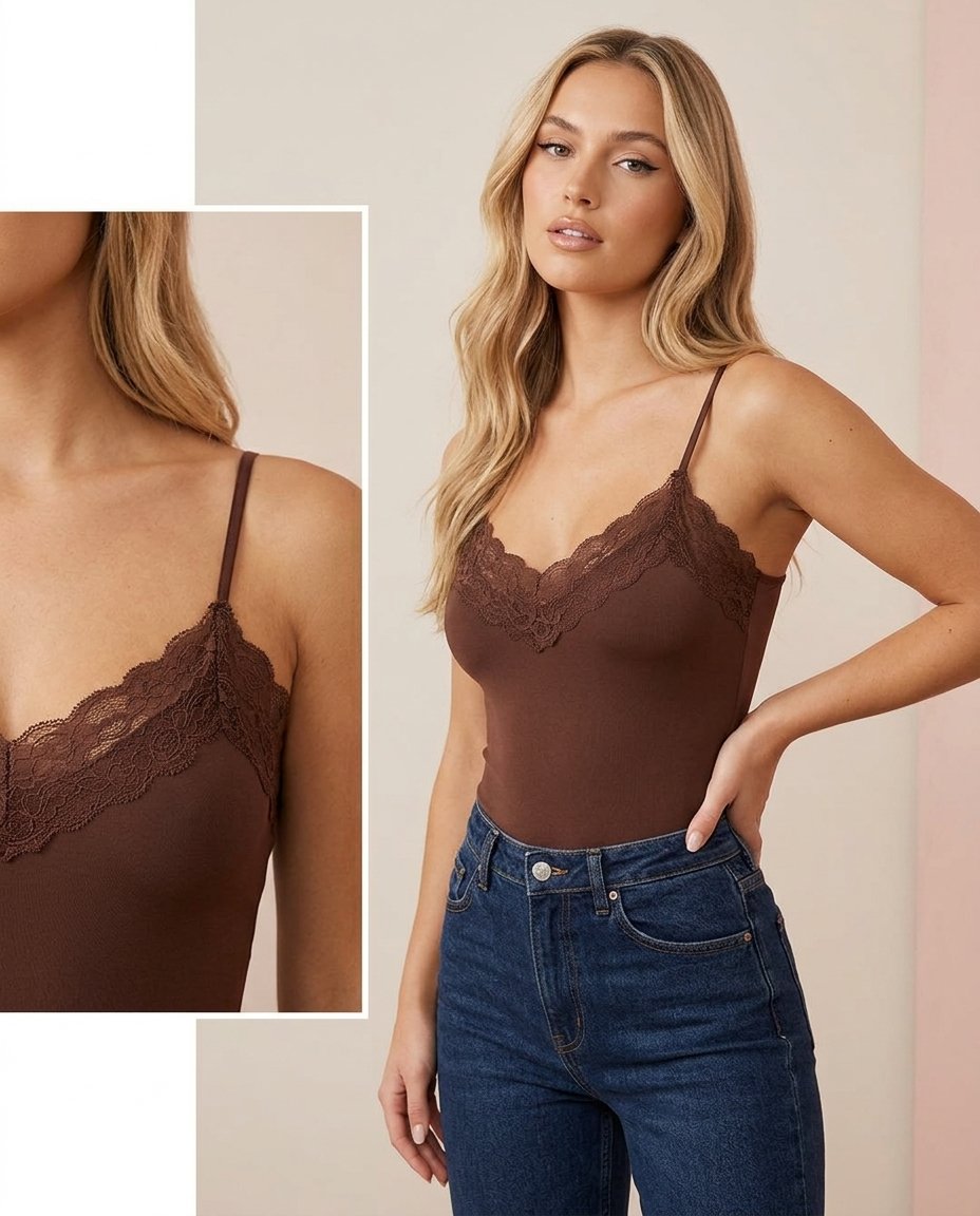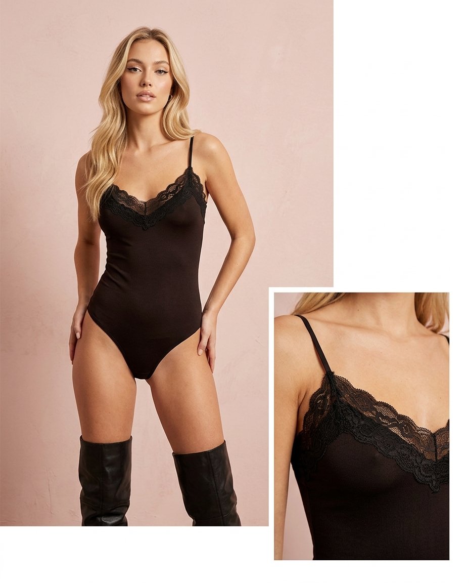 Body en tono marrón chocolate y negro confeccionado en tela suave y elástica que se adapta al cuerpo, realzando la silueta de forma natural. Su diseño incorpora puntilla en la parte superior, aportando un detalle delicado y femenino que eleva la prenda.