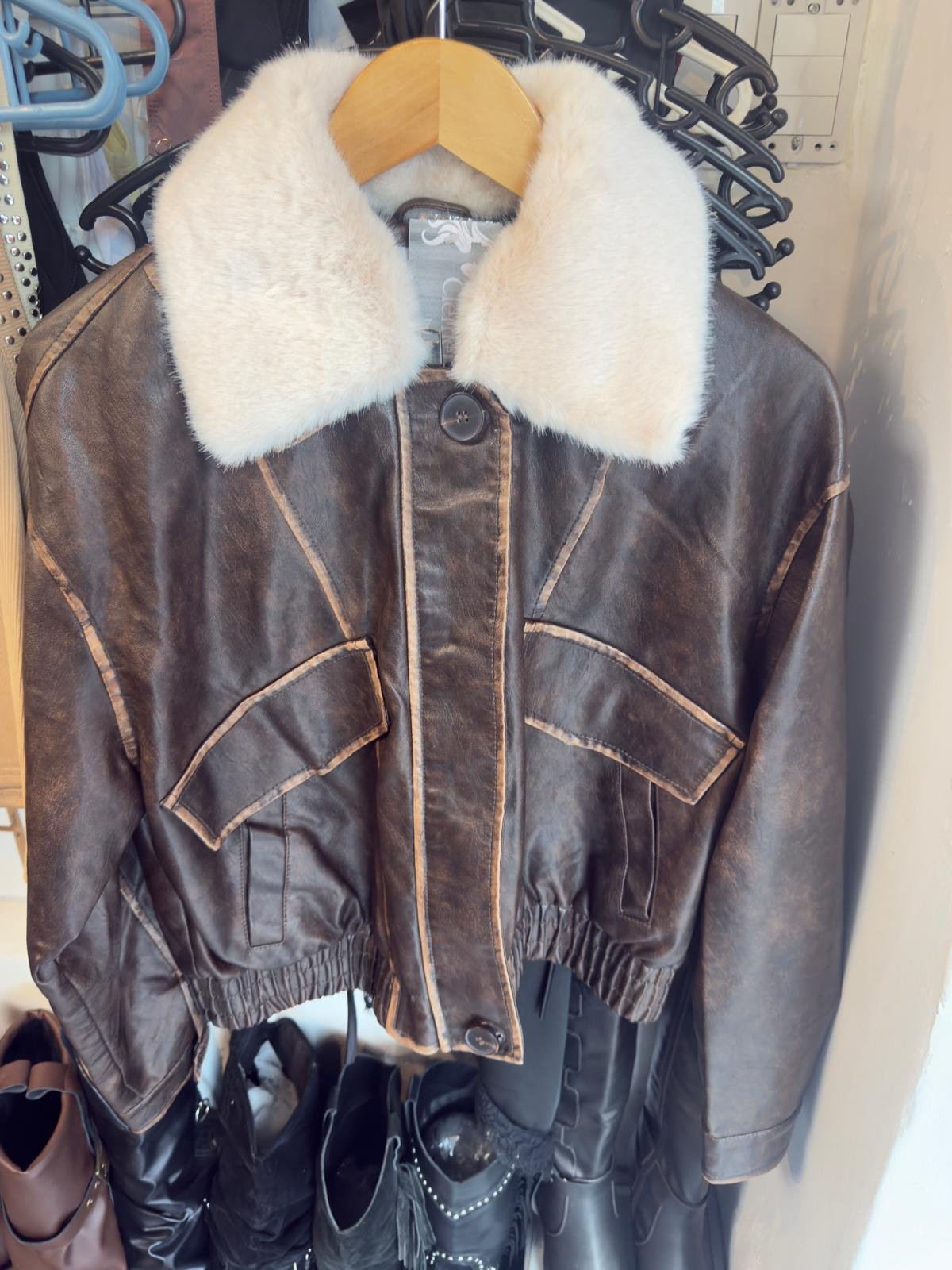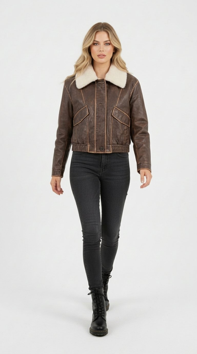 BOMBER VINTAGE CONFECCIONADA EN MATERIAL EFECTO CUERO DE ALTA CALIDAD CON TEXTURA SUAVE Y ACABADO LEVEMENTE ENVEJECIDO QUE APORTA CARACTER Y ESTILO. PRESENTA UN DISEÑO CLASICO CON CIERRE FRONTAL ,CUELLO DE CORDERITO DESMONTABLE ,AMPLIO Y DETALLES FUNCIONALES QUE COMBINAN ESTETICA Y COMODIDAD,SU CALCE ESTRUCTURADO REALZA LA SILUETA,CONVIRTIENDOLA EN UNA PRENDA VESATIL IDEAL PARA LOOKS URBANOS Y SOSTIFICADOS.