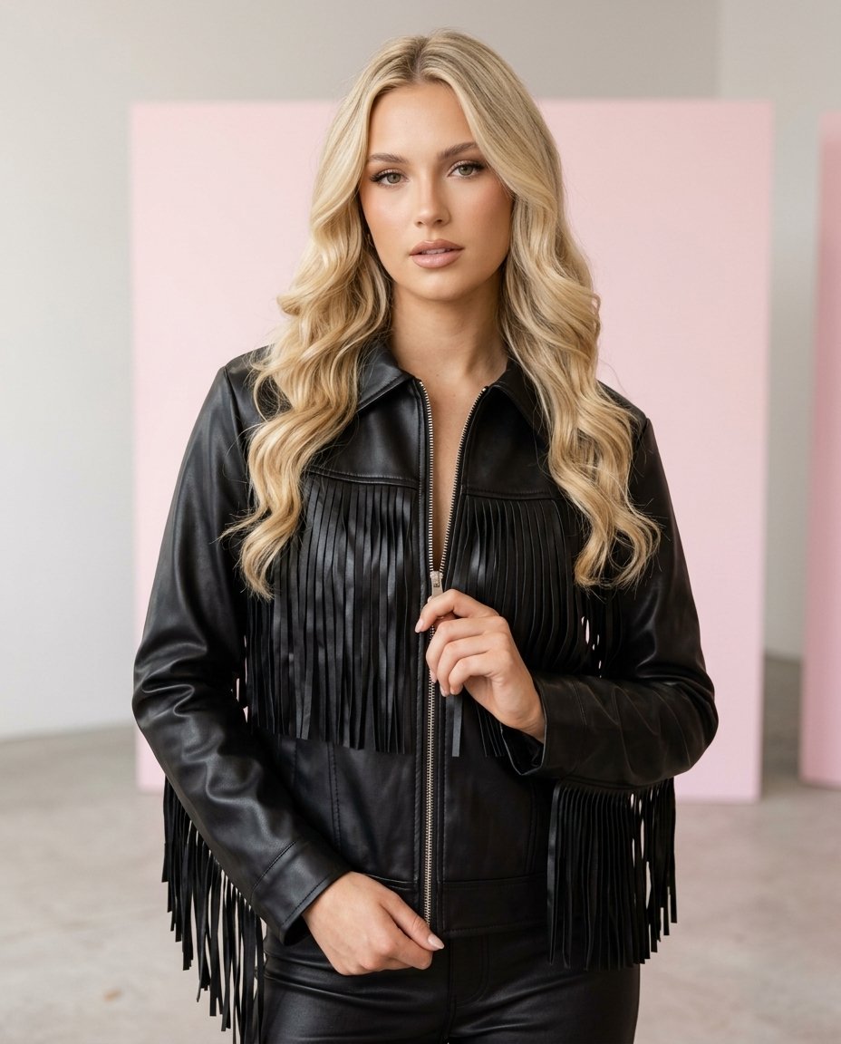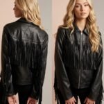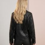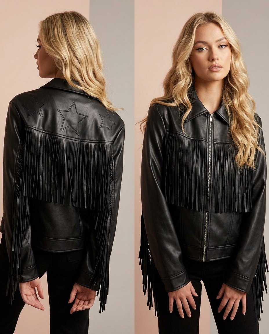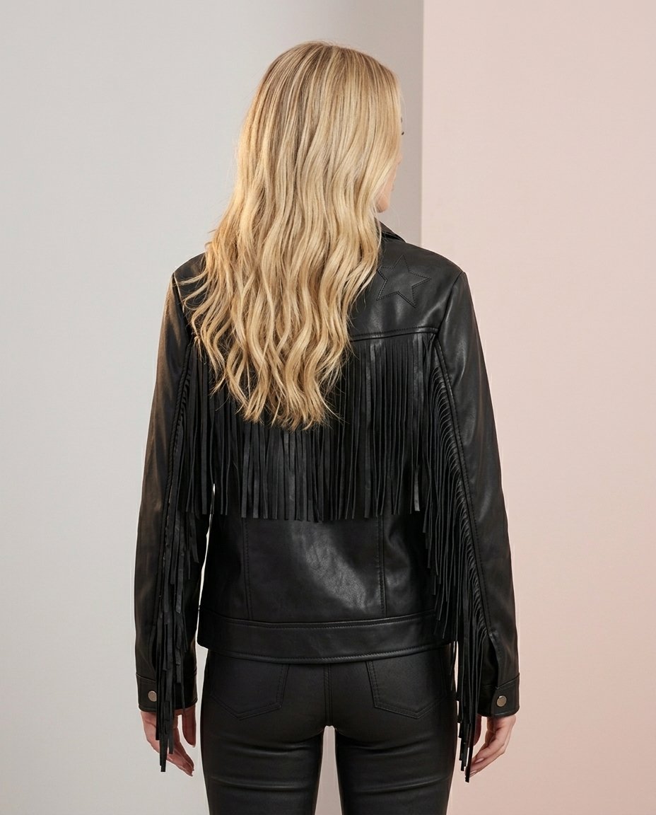 Chaqueta de ecocuero que combina actitud y detalle en una prenda única. Su diseño incorpora flecos que aportan movimiento y un aire western moderno, mientras que en la parte superior trasera y laterales se destacan estrellas bordadas que elevan el look con un toque distintivo y original.
