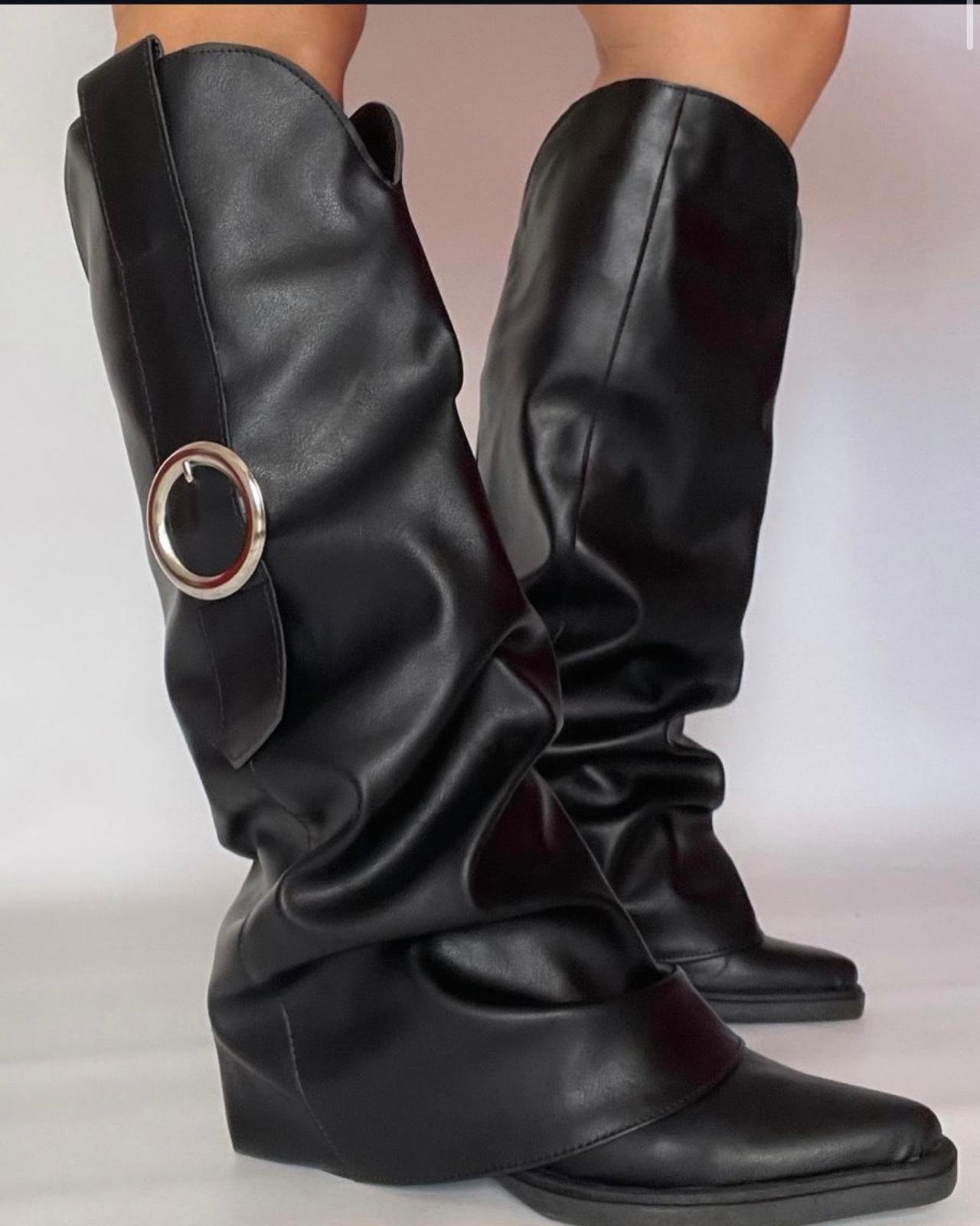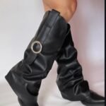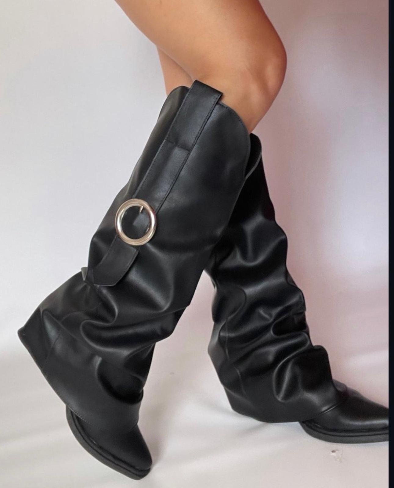 Elevá cualquier look con estas botas de caña media en acabado efecto cuero, diseñadas para destacar. Su silueta slouchy aporta un aire relajado pero sofisticado, mientras que la hebilla lateral oversized suma un detalle protagonista que marca tendencia.